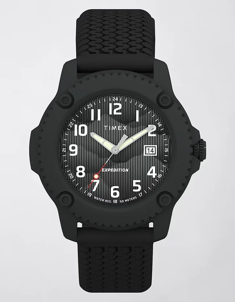 With its bold camo print dial and durable yet lightweight build, the Expedition Timber is strength, style, and utility, all in one fearless companion. Made from soft silicone that feels as good as it looks, the strap features a unique tread-marked texture that pairs handsomely with the rugged 42mm aluminum case.