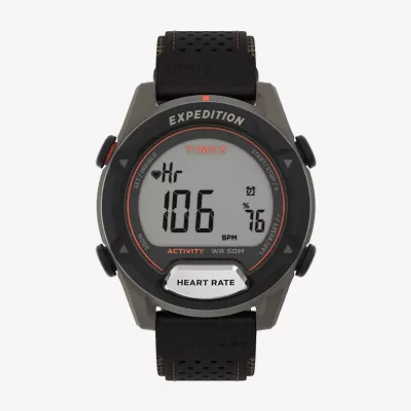 An outdoor ready smartwatch, our new Expedition Trailblazer+ with daily activity tracking and easy-touch, on-wrist heart rate monitoring is as adventorous as you are. It's packed with a countdown timer, chronograph, customizable alarm, and INDIGLO® backlight with a water resistant rating up to 50 meters. Featuring a substantial 43mm case size and Italian leather on the straps, this watch is a practical and durable companion, offering a casual look with a functional battery hatch so you can make the swap yourself as needed.