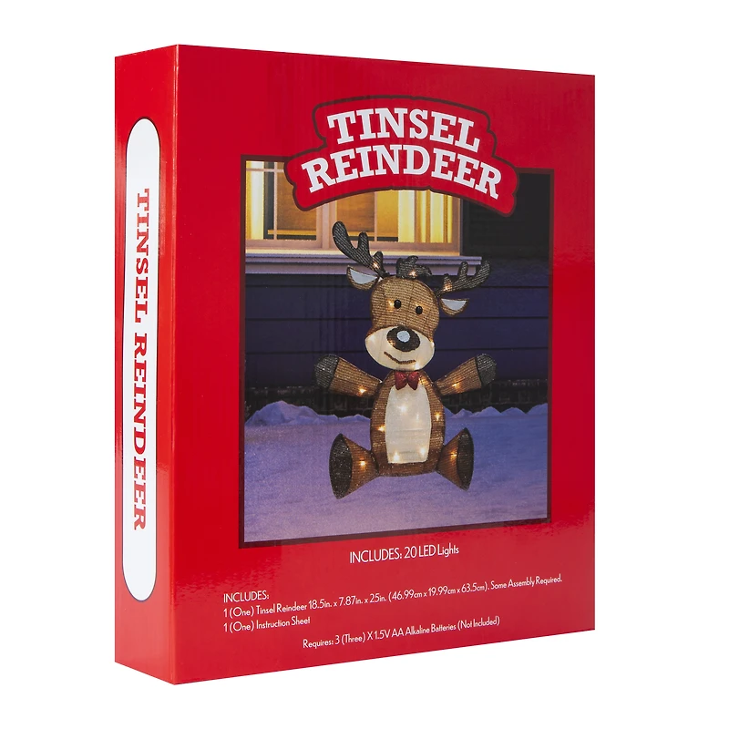- Add this cute tinsel reindeer to your outdoor holiday decor! The LED lights are battery-operated so you can place this buddy anywhere.