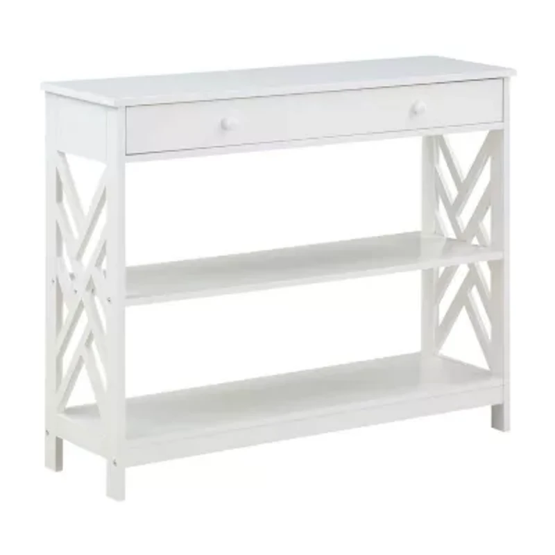 Style your home with the geometric design of the titan 1 drawer console table with shelves by convenience concepts. This transitional table features a pull-out drawer on smooth roller slides and includes two stylish drawer knobs for easy accessibility. This spacious drawer offers plenty of room to stow away entertainment essentials and everyday necessities. The unique dimensional side panels and the three tiers of shelving make this console the perfect decorative piece to display in any room of your home. Carefully crafted from mdf, non-lead-based paint, and particleboard, this unit was made for long-term use. Bring home coordinating pieces from the titan collection by convenience concepts, each sold separately.