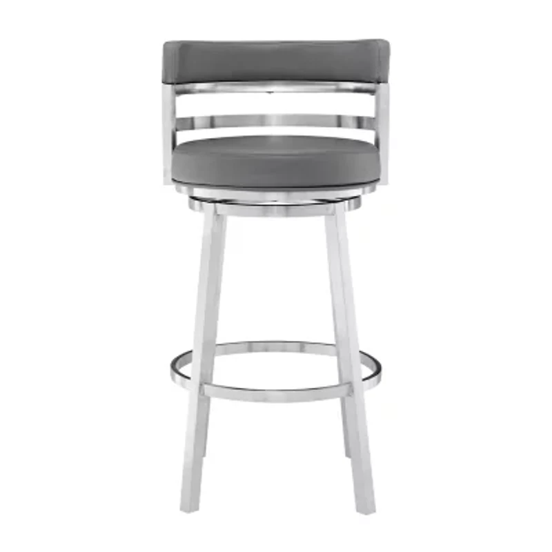 Style and function come together in harmony with the titana 26" counter height swivel gray faux leather and brushed stainless steel bar stool from Armen living. Its armless design makes this the perfect addition to any home or apartment as it allows you to pull the kitchen stool as close as needed to your kitchen island, peninsula counter, or home bar. The titana frees you of any visual constriction with the 360-degree swivel motion, helping to keep you engaged with your friends at family at gatherings. The upholstered low back is rounded, providing the user with exceptional ergonomic support. The titana's padded bar seat and back are constructed from high-density foam and wrapped in soft faux leather upholstery that will keep you comfortably seated for hours on end. The strong metal frame that's further accented by the inclusion of a round footrest. The titana's legs are tipped with floor protectors, assuring that the bar stool will not slip on or scratch hardwood or tile floors, ensuring a durable bar or counter stool that will last for many years to come. The titana bar or counter stool is available in 26" or 30" seat height and comes in a brushed stainless-steel finish with black, gray, white, blue, green, or red faux leather upholstery; a mineral finish with bandero tobacco or ford black faux leather upholstery, an auburn bay finish with brown faux leather upholstery, or a black finish with ford black faux leather upholstery.
