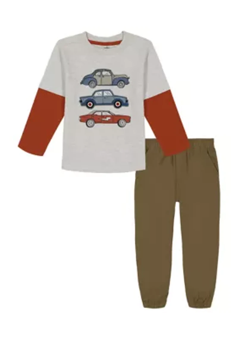 Perfect for your favorite car fanatic, this awesome cotton-blend t-shirt from Kids Headquarters pairs with easy-on joggers for a super fun look. 2-piece set T-Shirt: pullover, crew neck, long raglan sleeves Joggers: elastic waistband, 2 front slant pockets, 2 back patch pockets Imported Material & Care Cotton, polyester Machine washable