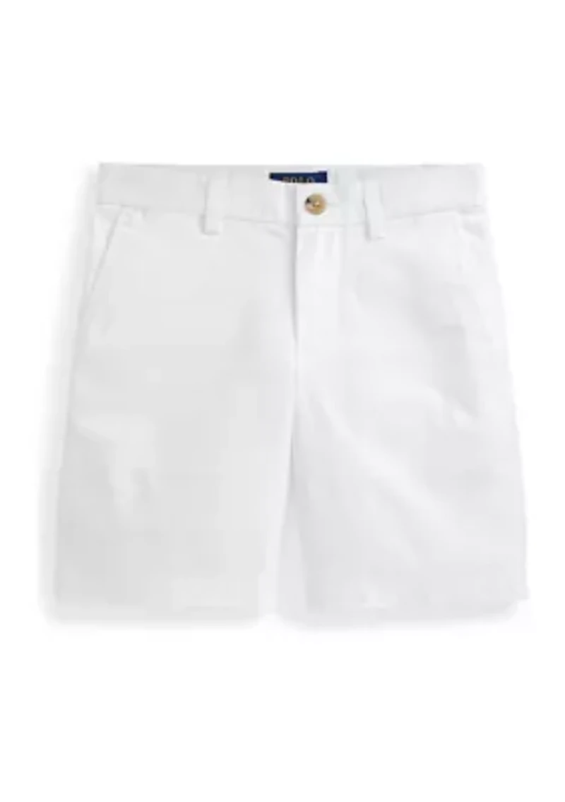 Cut for a slim fit from lightweight stretch chino, these Ralph Lauren Childrenswear shorts are a versatile wardrobe staple. Zip fly with a buttoned closure Adjustable buttoned tabs at the interior ensure a room-to-grow fit Two front angled pockets Right hip coin pocket Two back buttoned pockets Signature embroidered Pony above the back right pocket Straight Fit Imported Product Specifications Size 4/4T has a 5.5 in rise and a 5.75 in inseam Material & Care Cotton, elastane Machine washable