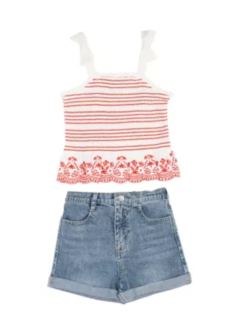 This Rare Editions outfit set is perfect for your girl! With a charming gingham top and denim shorts, she'll stay comfortable and look stylish all day long. 2 piece set Back elastic waistband Crew neck Sleeveless Imported Material & Care 100% cotton Hand wash