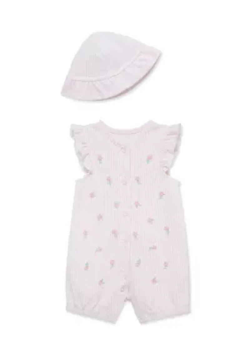 This baby girl's Picnic Romper and Hat set from Little Me is made from soft cotton, featuring a playful floral design. Comfortable and cute, it's perfect for outdoor adventures and sunny days! Snap closure Imported Material & Care 100% cotton Machine washable