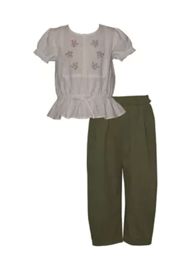 This adorable two-piece outfit from Bonnie Jean is perfect for your little girl. The set features a classic scoop neck top and stylish bottoms with a button closure. 2-piece set Top: scoop neck, short sleeves Bottom: button closure, paper bag Imported Material & Care 100% cotton Machine washable