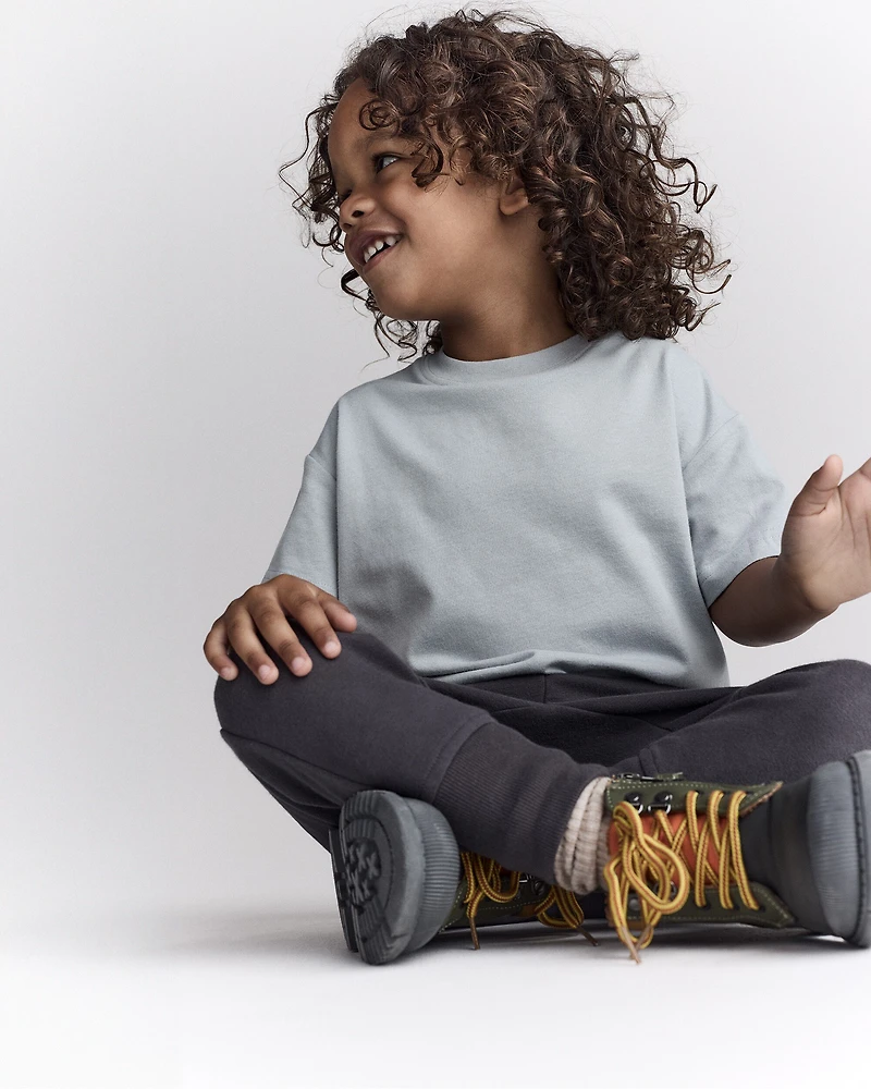 An everyday yes. Do-it-myself details like a hidden "F" so they can always find the front. Relaxed fit styling in super soft brushed jersey = no guessing games, no battles. Toddler-friendly taglessness? No question.