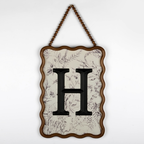 Personalize your home with this Toile Monogram H Wavy Wall Plaque. With its charming botanical pattern and scalloped frame, it adds custom beauty to any wall! Overall dimensions Width: 15.5 in. Depth: 1.18 in. Height: 31.25 in. Crafted of wood Brown frame finish Wavy frame design Features the monogram letter "H" Botanical toile pattern Hues of white, black, and gray Weight: 3.96 lbs. Hangs from a beaded string Care: Dust with a soft, dry cloth. Contact your local Kirkland's store for availability. Quantities and selection may vary by location. Sold in stores under item number 326309. WARNING: Cancer and Reproductive Harm - For more information go to www.P65Warnings.ca.gov .