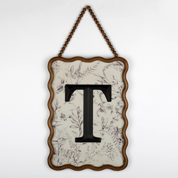Personalize your home with this Toile Monogram T Wavy Wall Plaque. With its charming botanical pattern and scalloped frame, it adds custom beauty to any wall! Overall dimensions Width: 15.5 in. Depth: 1.18 in. Height: 31.25 in. Crafted of wood Brown frame finish Wavy frame design Features the monogram letter "T" Botanical toile pattern Hues of white, black, and gray Weight: 3.96 lbs. Hangs from a beaded string Care: Dust with a soft, dry cloth. Contact your local Kirkland's store for availability. Quantities and selection may vary by location. Sold in stores under item number 326307. WARNING: Cancer and Reproductive Harm - For more information go to www.P65Warnings.ca.gov .