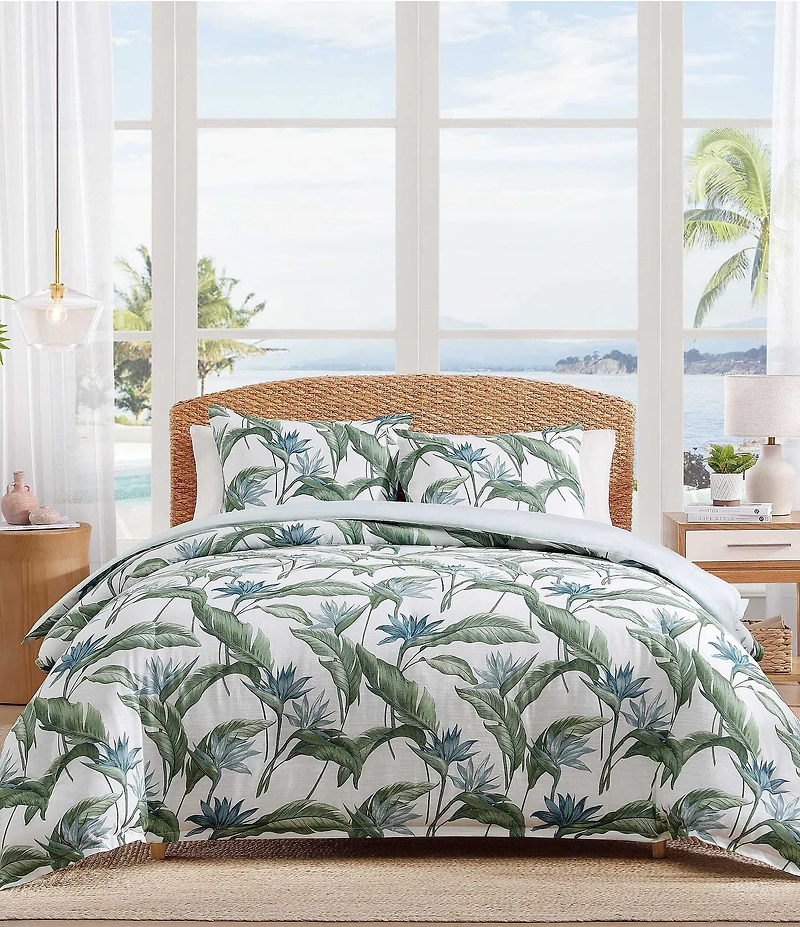 From Tommy Bahama, this comforter mini set features: Inspired by lush Island Foliage and relaxed seaside living, this design pairs graceful Birds Of Paradise motifs with a soft marina-inspired texture for a look that feels fresh and breezy Crafted from 100% cotton slub fabric, with polyester fill Rendered in soothing blue and green tones on a light ground, the allover print blends seamlessly with coastal décor Set includes comforter and two shams Comforter mini set is designed for easy care, everyday comfort, and long-lasting quality Care Instructions: Machine wash cold, separately Delicate cycle Do not bleach Tumble dry low Use extra large-capacity commercial machines Low iron when needed Do not dry clean Full/Queen comforter mini set includes: Comforter approx. 96" L x 92" W Two standard shams approx. 21" L x 27" W King comforter mini set includes: Comforter approx. 96" L x 110" W Two king shams approx. 21" L x 37" W Imported.
