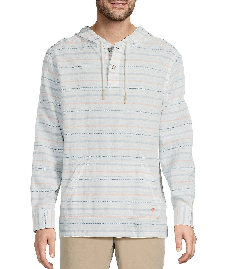 From Tommy Bahama, this hoodie features: Allover stripe print Regular fit Crew neck collar Long sleeves 2-button placket Kangaroo pocket at front Pullover construction Linen/viscose Machine wash/tumble dry Imported.