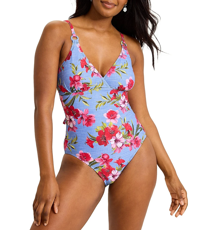 From Tommy Bahama, this one piece swim features: Plunge silhouette Floral print  V-neckline  Tall cups  Adjustable lace back  Self covered ring detail Tummy control  Moderate coverage  Lined  Pull-on construction Recycled nylon/spandex Hand wash  Imported.