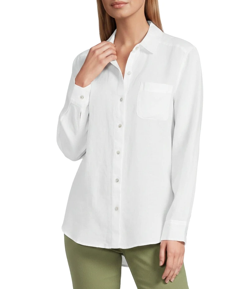 From Tommy Bahama, this shirt features: Linen fabrication Point collar neckline Long sleeves with button cuffs Chest pocket Pearl buttons Button front closure Approx. 28" length Linen Machine wash/hang to dry Imported.