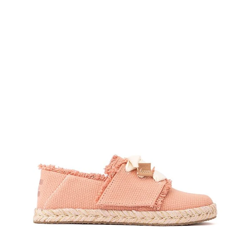 The toms carolina lace-up espadrille brings classic warm-weather style in a kid-friendly design. A rope-wrapped outsole in a comfortable height pairs with decorative laces layered over a hook-and-loop closure for easy on and off. Finished with woven uppers and frayed trims for a laid-back, sunny-day vibe. available online at journeyskidz. Com. Your toms purchase helps support children’s education, health, and well-being, giving kids everywhere the gift of better tomorrows