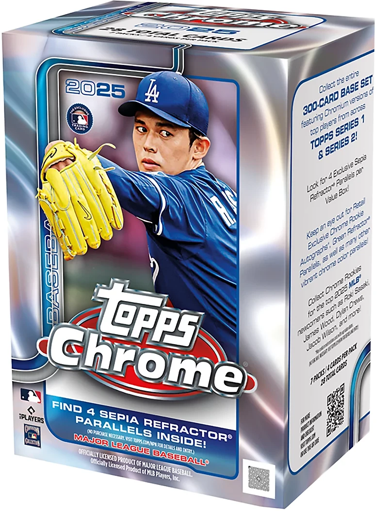 Add to your baseball card collection with the Topps 2025 Chrome Baseball Value Box. Its all-new lineup of inserts and chrome parallels excite card collectors. The box allows you to build the entire 300-card Base Set across a rainbow of color and tech parallels, and it includes 4 Sepia Refractor cards per pack, 7 packs per box.