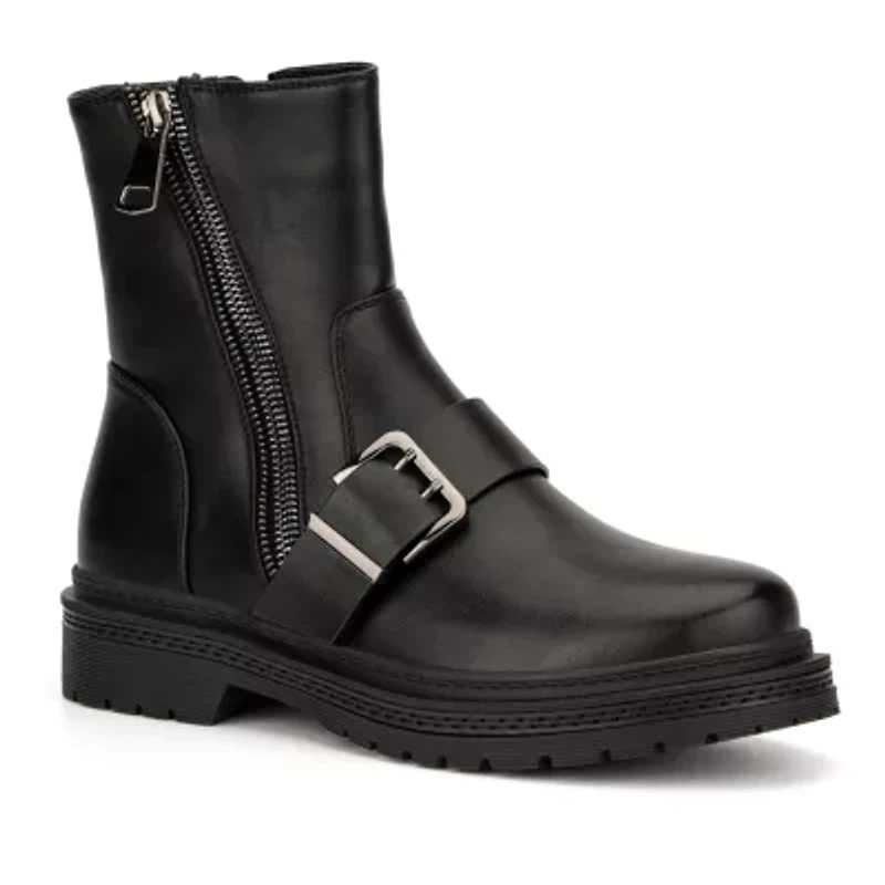 The Holly is a truly edgy moto boot that is so easy to style. Chunky modern profile with side zip closure and a wide buckle strap detail. Supple faux leather fabrication with a durable rubber lug sole and soft fabric lining for next-to-skin comfort.