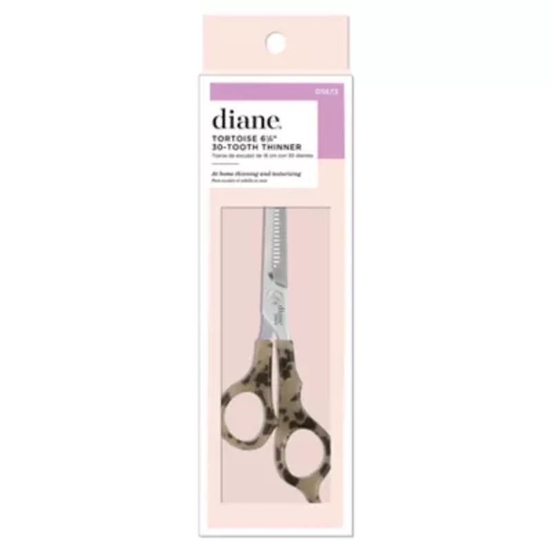 WHAT IT IS The Diane Tortoise Thinning Shear makes at-home hair thinning and texturizing easy and precise. Crafted from high-quality Japanese steel, it includes microserrated thinning teeth for a smooth, professional look. The durable beveled blade and tortoise-patterned handle offer both performance and comfort in one stylish tool. PRODUCT DETAILS • Microserrated teeth deliver an inherent, blended result • Made with high-quality Japanese steel for enduring performance • Beveled blade secures smooth, controlled thinning • Comfortable grip with an unique tortoise design for easy handling Imported