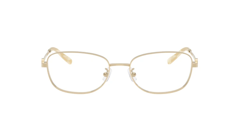 The tory burch ty1098 optical glasses embody timeless elegance and modern design. Crafted from lightweight metal, the rectangular frames feature softly rounded edges for a sleek silhouette. Adjustable nosepads glasses provide a comfortable fit, while the gold tone adds a polished touch. Flat, slender temples adorned with the iconic double t logo complete the sophisticated look of these tory burch glasses.