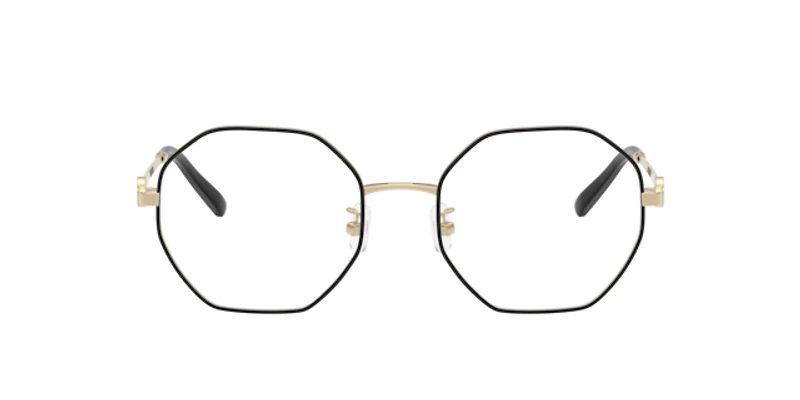 Introducing the tory burch ty1099d optical glasses, a modern statement piece for adults. The irregular frames crafted in lightweight metal feature a gold front that exudes sophistication. Flat, slender temples, crafted in matching metal, are adorned with the iconic double t logo for a touch of refined brand flair. Designed with a standard bridge and frames with a low bridge fit for added comfort, these eyeglasses pair clear lenses with a bold look that truly stands out.