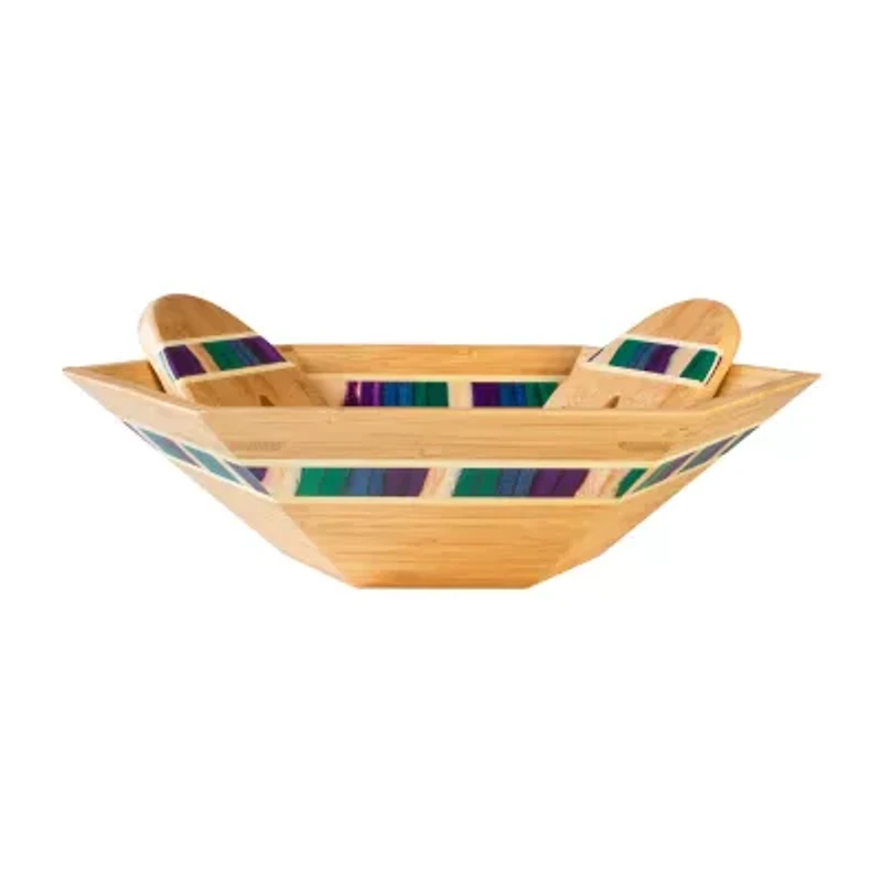 Serve delicious salads to friends and family with the eye-catchingly colorful Baltique® Mumbai collection 14" salad bowl with salad hands set. Crafted from bamboo and featuring an inlay of colored Baltique Mumbai birch wood, this serving set features a beautiful array of color. Our Mumbai collection is inspired by the extravagant plumage of India’s national bird, the peacock. The blend of electric blue, vibrant green, noble purple and natural birch wood bring an eye-catching pop of color to the kitchen. The large 14-inch salad bowl is perfect for serving favorite salads and pasta dishes. It also works wonderfully for popcorn, chips, and other snacks. The included salad hand serving utensils are a naturally easy way to toss and serve salad. When the serving is done, wash or wipe the bowl and salad hands with a damp cloth or sponge; they should not be soaked or washed in the dishwasher.