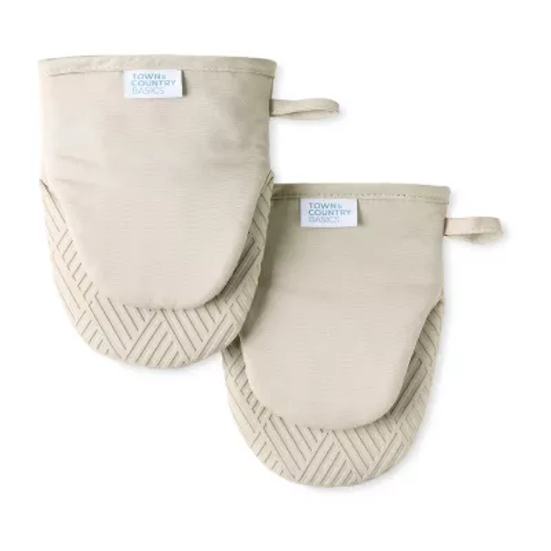 Shield your hands from the heat with the Town & Country Basics Basketweave Soft Silicone 2-Pack Mini Oven Mitts. These flexible soft silicone mini mitts offer a safe and easy way to move hot dishes and bakeware from the oven or stove while cooking. With a stylish basketweave-textured silicone grip, heavy-duty 100% Cotton fabric lining and insolation, and heat resistance up to 500 degrees Fahrenheit, these mini mitts are the ideal kitchen essentials for any home cook. Each mini oven mitt measures 5.5 inches by 8 inches for a comfortable fit.  This matching kitchen set features convenient hanging loops to easily display or store them when not in use. These mini mats are easy clean, simply wipe clean or rinse underwater for a clean start. Pair your Basketweave Soft Silicone Mini Mitts with coordinating kitchen accessories from the Town & Country Basics collection.