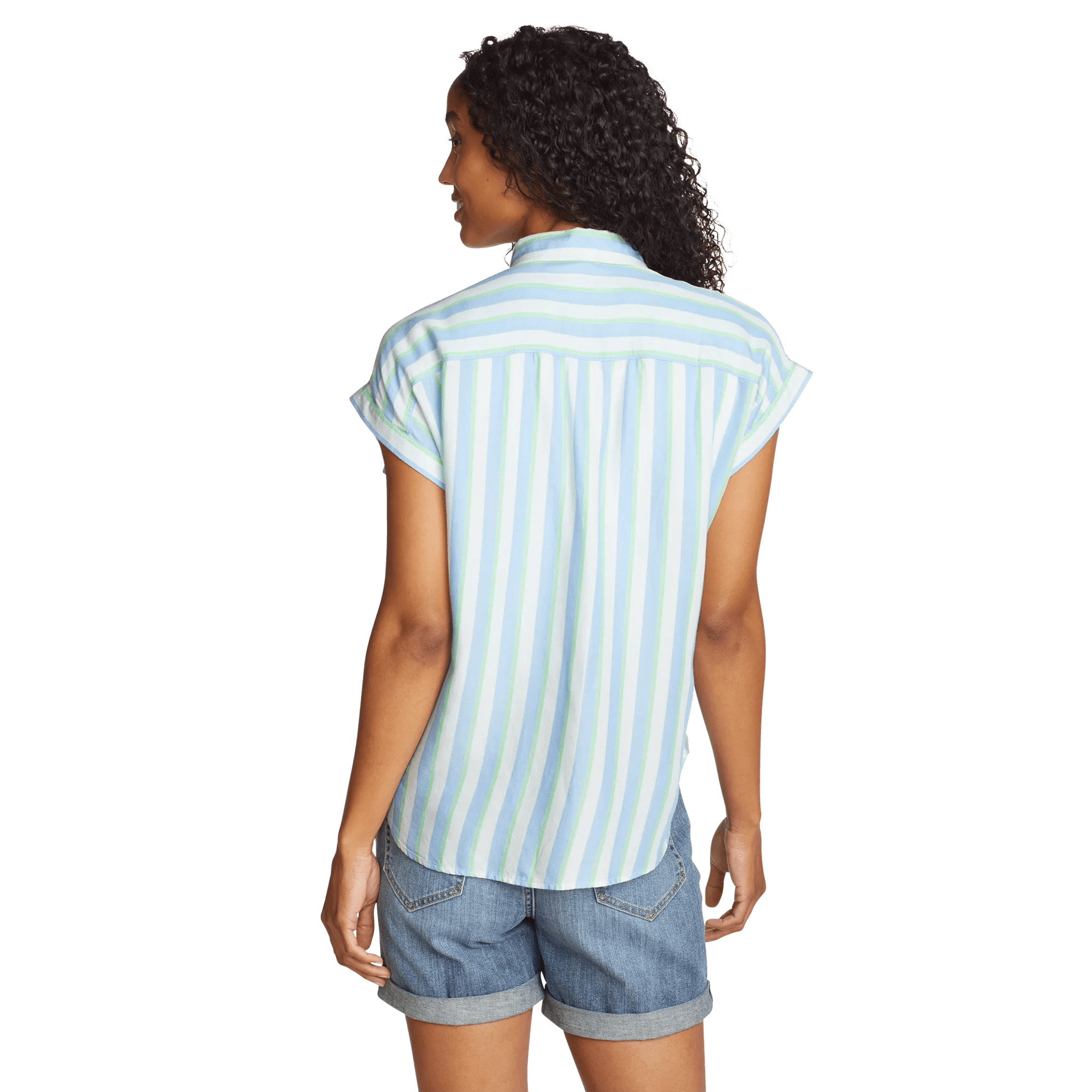 The rayon/cotton/TENCEL™ lyocell fabric blend in this top is soft, breathable, and drapes beautifully. Feminine touches include shirring at the shoulders and rolled-look cap sleeves. Shirttail hem can be styled in front by tying or by leaving untied.