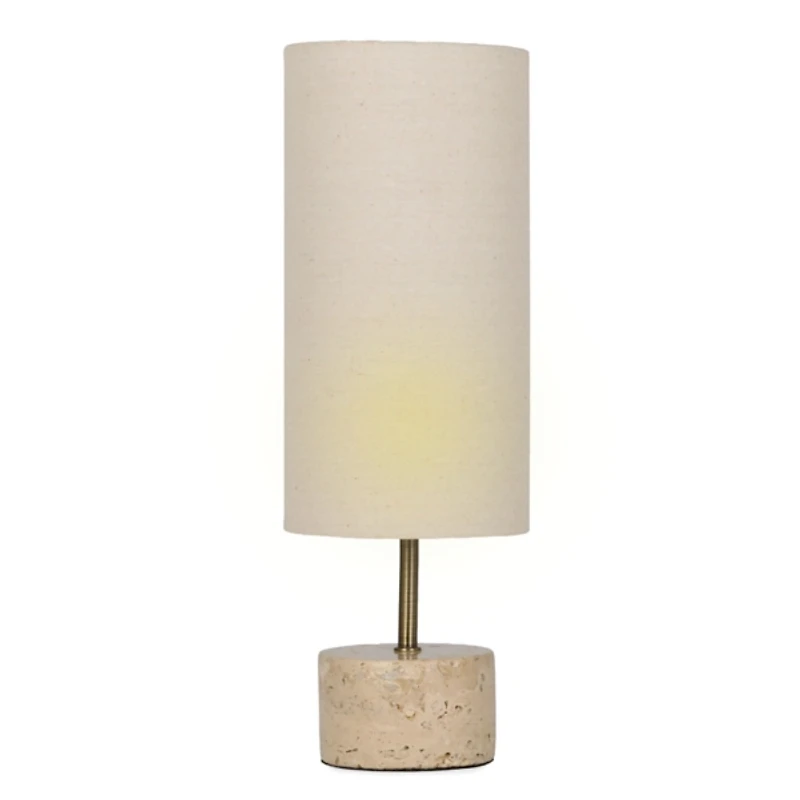 Chic and sophisticated, this Travertine Cylinder Table Lamp effortlessly elevates any space. You'll love the warm, modern glow it brings into your home! Lamp measures 15.5H in. Crafted of travertine and metal Ivory finish with gold accent Round stone base Hardback cylinder shade in oatmeal fabric Shade measures 11H x 5.5 in. in diameter Socket accommodates a 40-watt, E26 bulb Features a clear, plug-in cord with an in-line on/off switch Care: Dust with a soft, dry cloth. Do not exceed specified wattage. Contact your local Kirkland's store for availability. Quantities and selection may vary by location. WARNING: Cancer and Reproductive Harm - For more information go to www.P65Warnings.ca.gov .