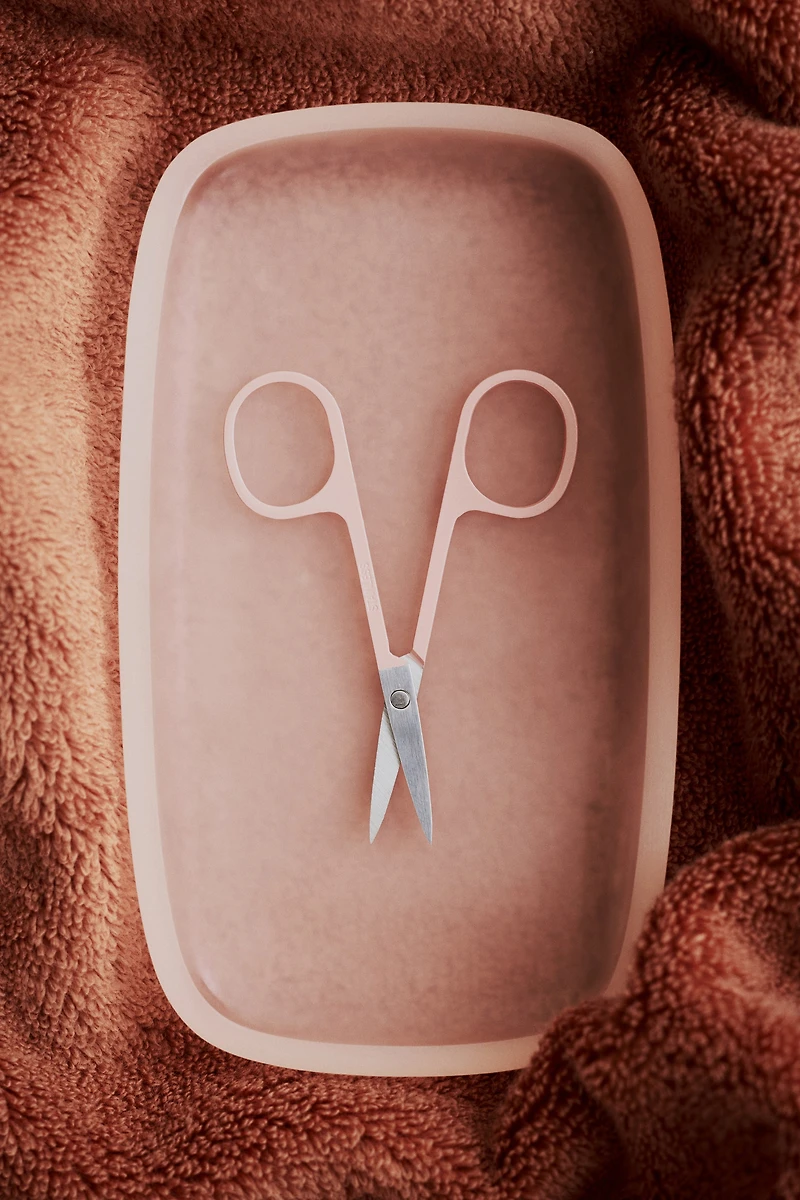 Tray in plastic with a gently squared design and smooth, rounded edges. Sized to fit a matching soap dispenser and toothbrush mug.