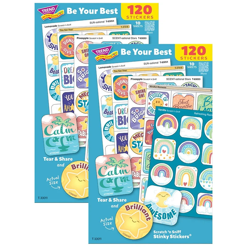 Prepare to motivate! Each handy assortment pack of 120 stickers includes two sheets each of the Tear & Share titles Mindful Moments and You Got This! and two sheets each of the Stinky Stickers titles SCENT-sational Stars, Refreshing Rainbows, and SUN-sational. Stickers are nontoxic, acid-free, and great for use in scrapbooks and journals as well as in crafts, correspondence, and awards. Encouraging words with calming colors and artwork help promote mindfulness, confidence, and self-care for all ages. Stickers are easy to peel from their backer sheet. 60 sticker designs and sized 1.25" across. Stickers are of various sizes and are made in the USA. Intended for ages 3 and up. Sold as 2 packs for a total of 240 stickers.Details:Multicolor1.25" acrossAvailable in various sizesSold as 2 packs total of 240 stickersAges 3+Made in USANontoxic and Acid-free