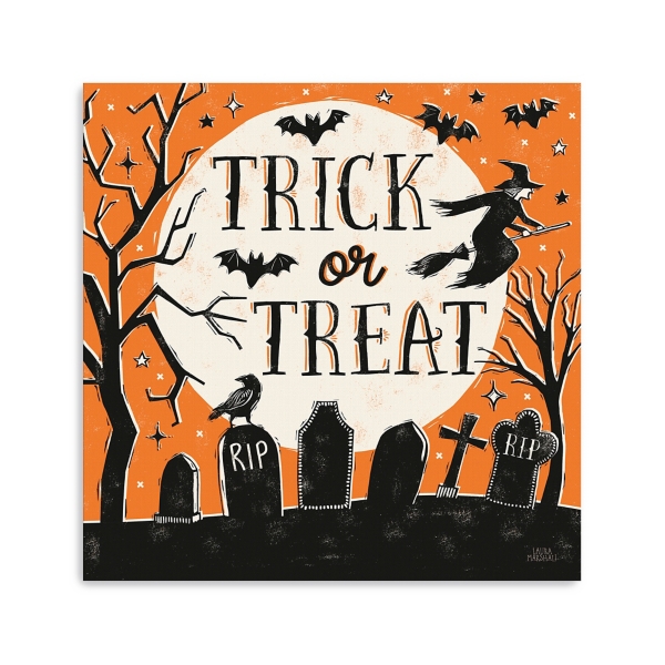 Decorate for spooky season with this Trick or Treat Graveyard Canvas Art Print. With a witch and bats flying around, this piece has a frighteningly fun flair! Art measures 20L x 1.25W x 20H in. Distinctively printed on stretched canvas Wrapped edges complete the look Features the phrase "Trick or treat" with a graveyard subject Hues of orange, black, and white Artist: Laura Marshall Weight: 3.61 lbs. Hangs from back-mounted hardware Care: Dust with a soft, dry cloth. Avoid exposure to heat, sunlight, and moisture. This item is available at Kirklands.com only, not available in stores. Please note: this item cannot be shipped to APO/FPO addresses.