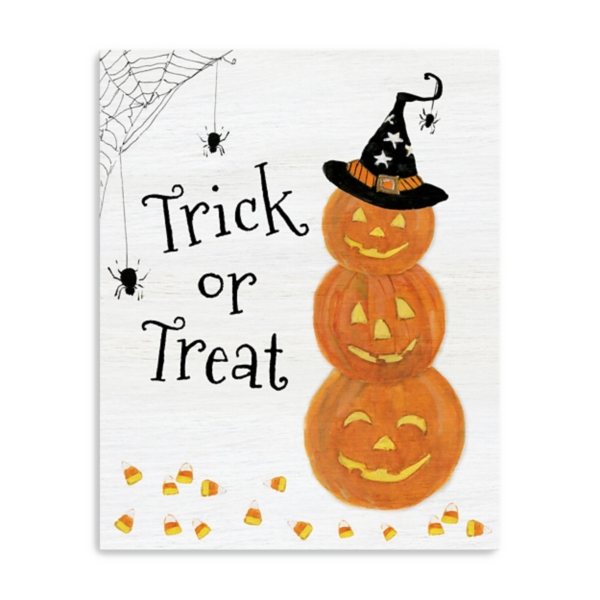 Get ready for spooky season with this Trick or Treat Jack O' Lanterns Canvas Art Print. The smiling Jack o' lanterns will bring a playful spirit to your haunted house! Overall dimensions Width: 16" Depth: 1.25" Height: 20" Giclee printed on stretched canvas Wrapped edges complete the look Reads "Trick or treat" Features stacked jack o' lanterns Spider and candy corn accents Hues of white, orange, black, and yellow Artist: Sally Swatland Weight: 2.45 lbs. Hangs from back-mounted hardware Care: Dust with a soft, dry cloth. Avoid exposure to heat, sunlight, and moisture. This item is available at Kirklands.com only, not available in stores. Please note: this item cannot be shipped to APO/FPO addresses.
