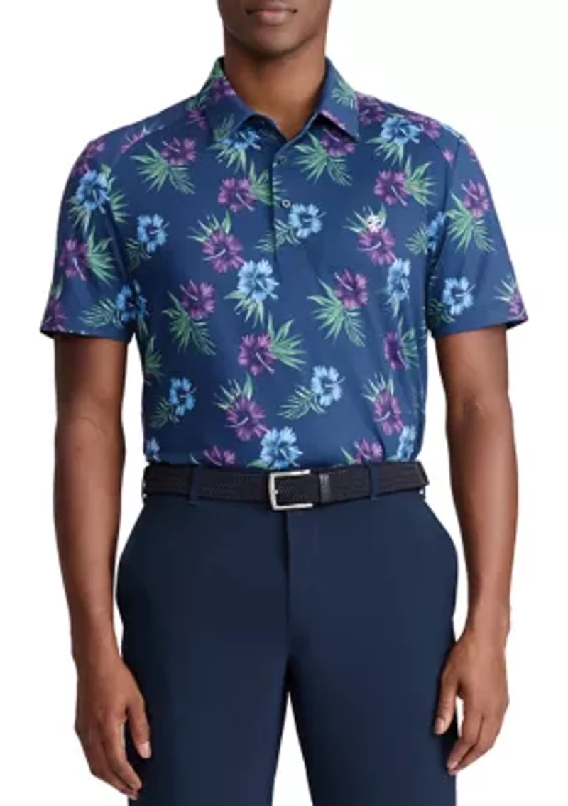 Add a fresh pop of color to your casualwear with this soft polo shirt from IZOD. Designed for versatility and easy wear, this shirt is finished with a striking print that makes it an absolute must-have for warmer seasons. 170GSM Carbonized Jersey All-over mini prints Wicking Quick-drying UPF Protection Luxe hand feel Button closure Collar Short sleeves Tropical pattern Imported Material & Care Polyester, spandex Machine washable