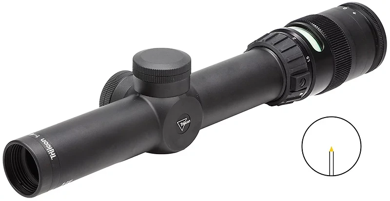 Bring your target into focus with the Trijicon AccuPoint 1 - 4 x 24 Riflescope. With multicoated optics for excellent light transmission and a quick-focus eyepiece, this riflescope provides sharp images. Aircraft-quality, hard-anodized aluminum construction ensures lasting use, and the nitrogen-filled tube helps prevent corrosion and fogging. The waterproof and shock-proof design enables use in harsh environments, while Manual Brightness Adjustment Override lets you control fiber-optic light output during daylight use. Matte finish. Long 3.2" eye relief.