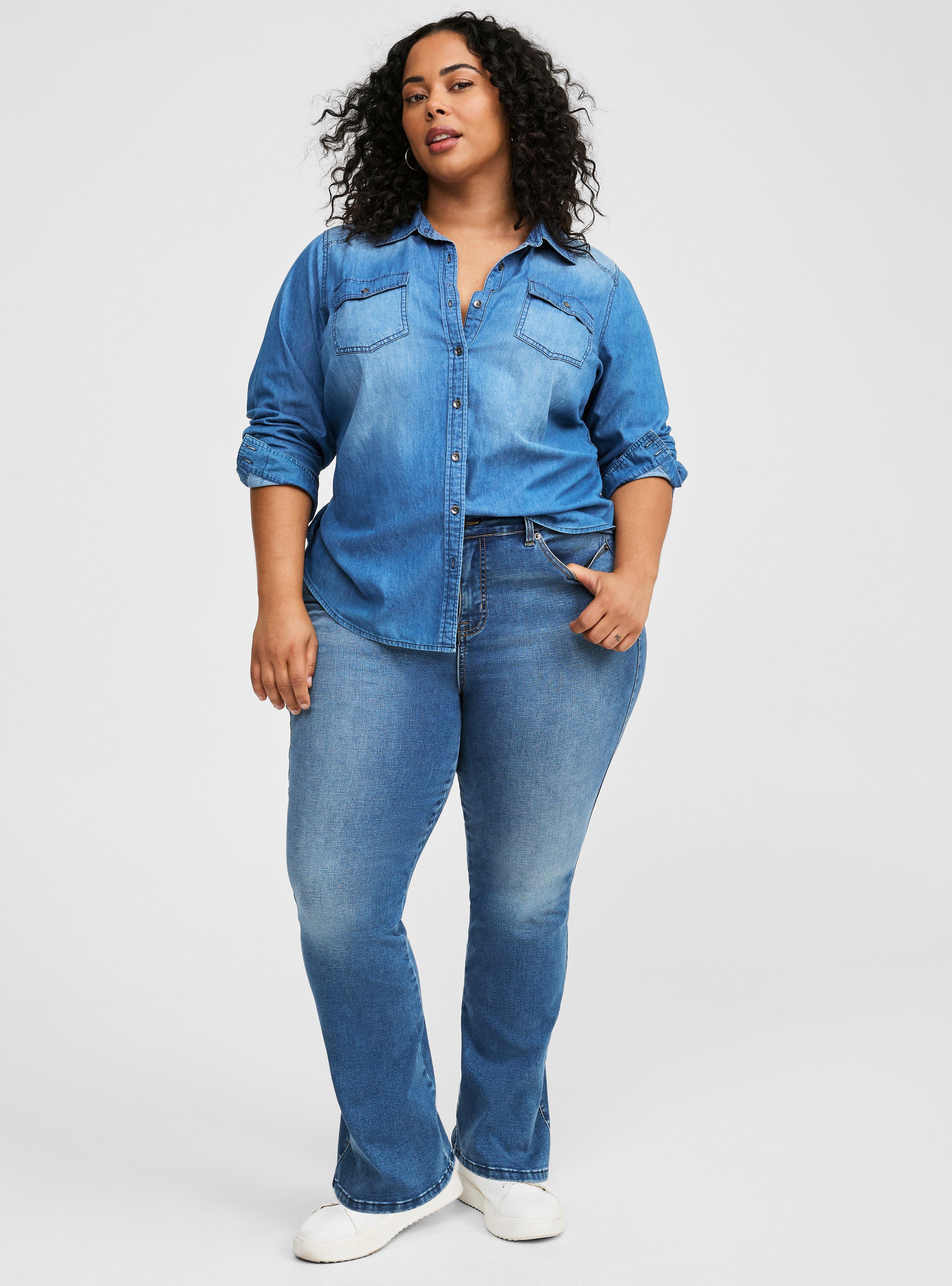 FIT Stretches up to three sizes so it always fits no matter what. High rise. Slim fit from hip to thighs, then kicks out into the perfect boot cut. Inseams: Short 29'', Regular 31'', Tall 33''. MATERIALS + CARE Limitless Stretch Denim fabric: A superpowered fabric that stretches up to three sizes, holds its shape and fits every body type. Stretch level: Hyper Stretch. 86% cotton, 11% polyester, 3% spandex. Imported. DETAILS 5-pocket design. WHY WE LOVE IT We all fluctuate sizes, why not have a jean that does too? This three-sizes-in-one style changes with your body, so you can feel good in it every time you slip it on. Say hello to the jean of the future.