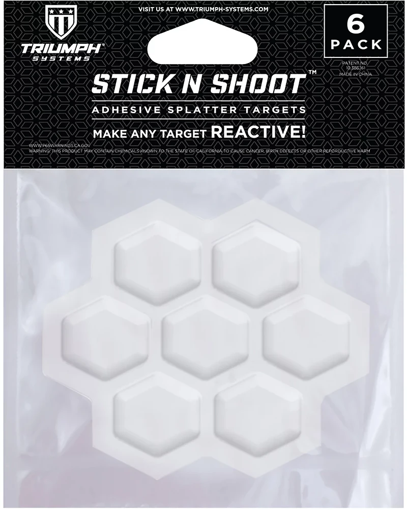 Use the Triumph Stick N Shoot Adhesive Reactive Targets 6-Pack to practice your shooting skills. Made with plastic and nontoxic materials, these targets can stick to many target types, including paper, cardboard or splattering targets. Each target bleeds, providing instant feedback as you shoot.