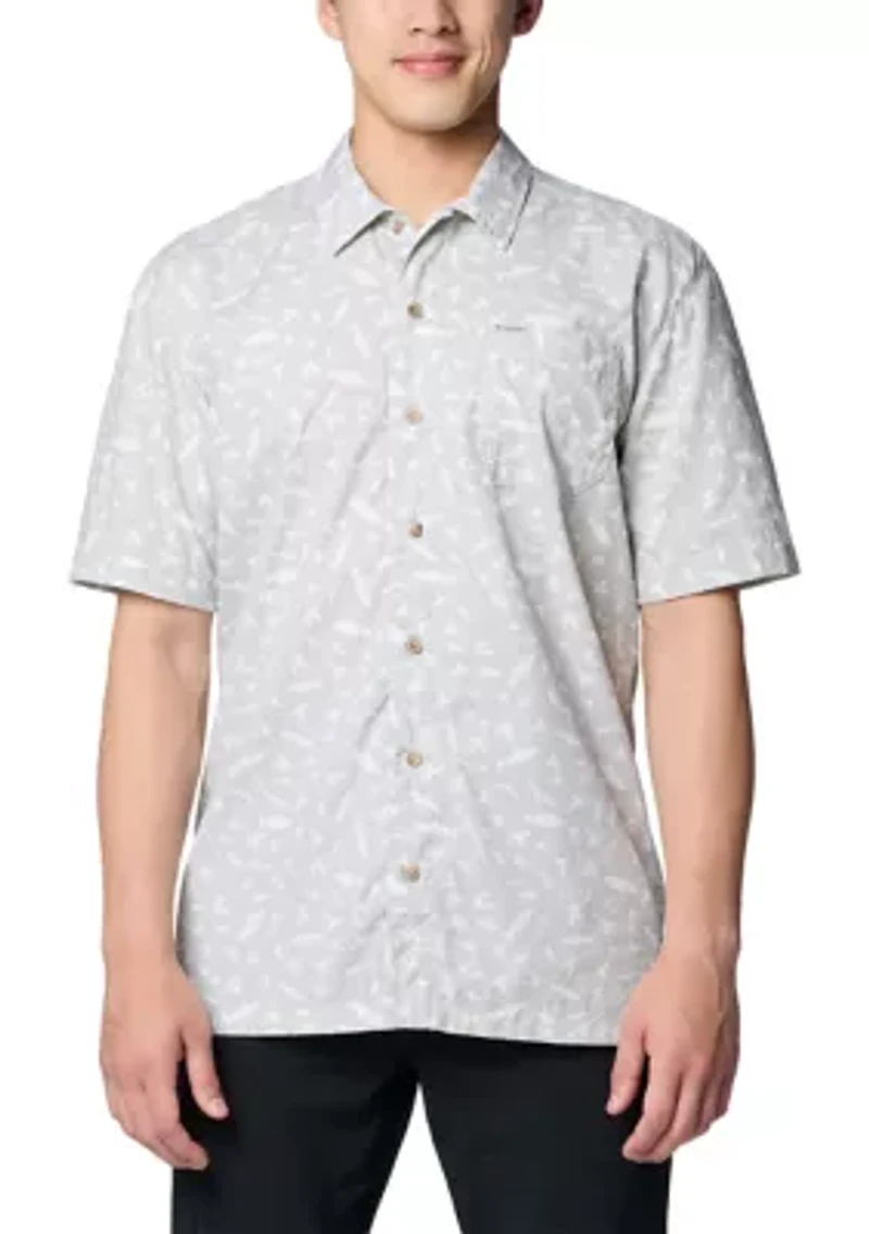 This shirt from Columbia is a must-have for any fishing enthusiast. Made from 100% cotton, it's breathable and comfortable, perfect for a day on the water. The regular fit and spread collar provide a classic, relaxed look, while the button closure ensures a secure fit. With its abstract pattern and vented design, this shirt is both stylish and functional. Whether you're casting a line or just relaxing on the beach, this shirt will keep you looking and feeling your best. Button closure Spread collar Short sleeves Patch pocket Mesh lining Regular fit Imported Material & Care Cotton Machine washable