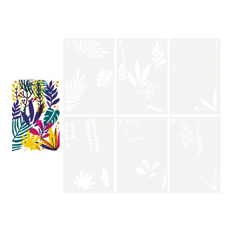 Transform your paper crafts into works of art by using layering stencils to create a unique tropical foliage image. Secure stencil 1 on your paper with washi tape, apply the desired ink color(s), remove the stencil, and repeat the steps with the rest of the stencils.Details:Tropical Foliage4" x 6" (10.1cm x 15.2cm)6 stencilsPETCare & Usage:To clean, gently wipe the stencils using a soft or slightly damp cloth and let dry after each use.Place stencils in the same location on your paper for each layer.Apply inks starting with the lightest shade to the darkest shade.