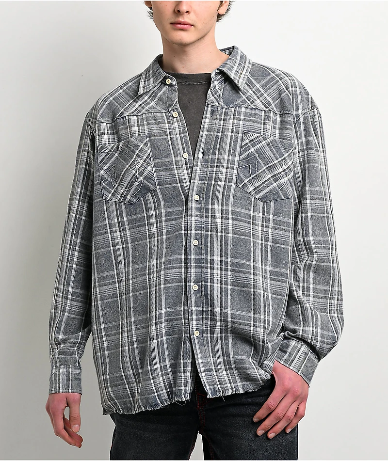 Bringing streetwear roots to a formal staple, the Bleached Horseshoe flannel shirt from True Religion arrives in a Cobalt plaid design that looks grey from a faded wash treatment. Designed with an unfinished bottom hem to further the worn vibe, the f