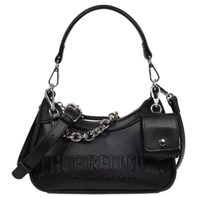 Soft structure meets signature attitude in the True Religion Trapunto Logo Zip-Top Hobo. Designed with a sleek, curved silhouette, this modern hobo features an embossed Trapunto True Religion logo across the front for a bold yet refined statement. Available in Black and Cream, this versatile bag is finished with a secure zip-top closure and polished hardware. The interchangeable straps let you switch up your look—carry it by the smooth shoulder strap for everyday ease or attach the chain strap for elevated edge. A removable mini pouch clips onto the bag, adding both function and signature True Religion flair. With a spacious interior lined in branded fabric, this hobo is perfect for day-to-night wear, travel, or anytime you want effortless style with iconic branding. -Officially licensed True Religion product -20.5" - 23" Adjustable removeable shoulder strap drop -Interchangeable Removeable 6.5" shoulder strap drop and 8" chain strap -Silver hardware -Zip Closure -True Religion Signature polyester lining -Interior: backwall zip pocket, Frontwall slip pocket. -Exterior: Removable mini pouch with snap closure 2.5"H x 2"W x 1"D -Material 100% Polyurethane -Dimension: 6.5H X 9W X 3.75D -Weight 2 lbs. -Imported 20.5" - 23" Adjustable removeable shoulder strap drop Adjustable strap Imported Product Specifications 6.5H X 9W X 3.75D Material & Care polyurethane Clean with a soft cloth.