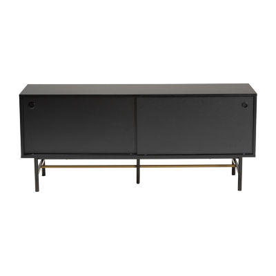 Delight in the refined, modern minimalist design of the truett tv stand. made in china, this avantgarde piece consists of a solid metal base fitted with wood and supports televisions measuring up to 58 inches. the sliding doors open to reveal two spacious shelves that perfectly accommodate media device, movies, and other living room essentials. the truett requires assembly and features four cord management holes on its back panel for quick and easy setup. presenting sleek modern flair while organizing your space, the truett tv stand enhances any living room layout. overall: 53.10" w x 15.70" d x 22.40" h; top storage space behind door(each):: 25.60" w x 13.10" d x 8.75" h; bottom storage space behind door(each):: 25.60" w x 13.10" d x 4.00" h; clearance: 7.90" h;