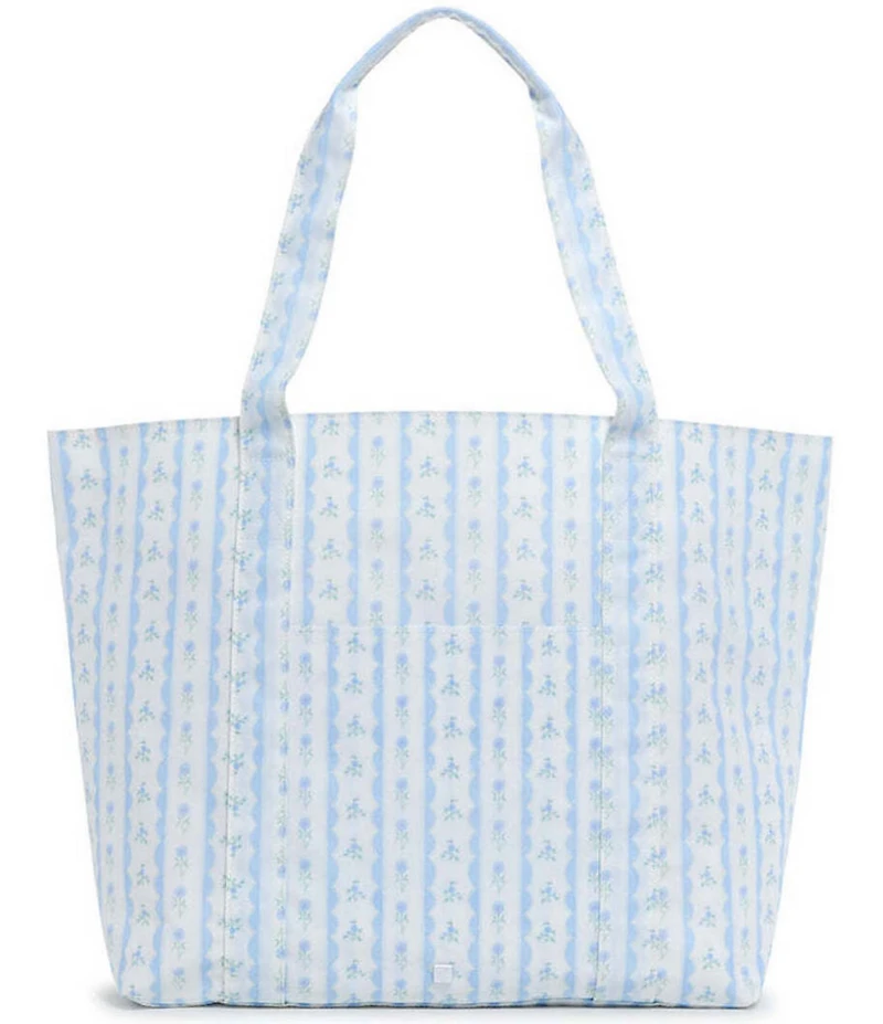 From TRVL Design, this tote features: Underneath the strap is satin webbing designed to prevent from slipping Interior full slip pocket and zippered pocket Front exterior pocket Exterior trolley pass-through Lightweight and useful year-round for all occasions Can be used as your beach bag or for everyday needs Water-and-stain resistant, wipeable inside and out 16.25" base x 15" tall x 7" deep x 23" top 10" handle drop Signature coated cotton Polyester twill lining with chunky white zipper One size Wipe clean with a damp cloth Imported.