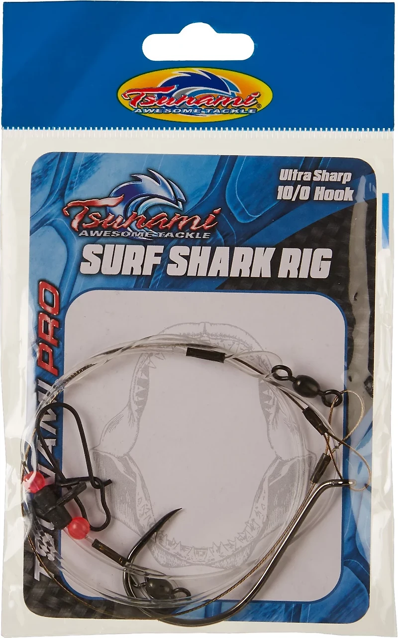 Enjoy a successful shark fishing trip with help from the Tsunami Surf Shark Rig 10/0 Hook. Built to withstand harsh saltwater conditions, this hook is constructed from heavy-duty steel cable and mono for lasting use. Size 10/0.