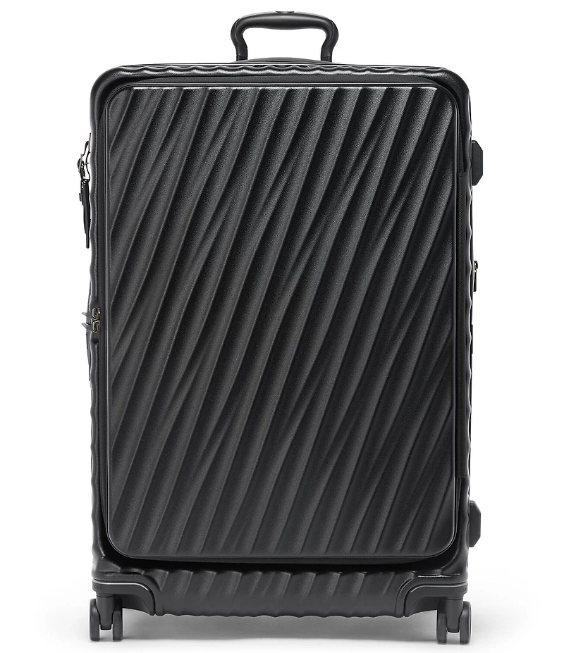 From the 19 Degree Collection by Tumi, this Large Front Access Expandable Checked Luggage features: Cleverly crafted to accommodate even the tightest spaces, this large checked luggage seamlessly blends our iconic 19 Degree contours with the versatility of front-lid entry. Exterior Front lid zip entry to main compartment Retractable top and side carry handles 3-stage telescoping handle Zip expansion 4 dual outboard wheels Intergrated TSA combination lock Monogram patch Luggage tag Interior Compression straps U-zip pocket 2 mesh zip pockets TUMI Tracer® Specifications Polycarbonate Expanded Depth 13" Weight 12.7 lbs Capacity 99 L Approx. 30" x 20" x11" Imported.