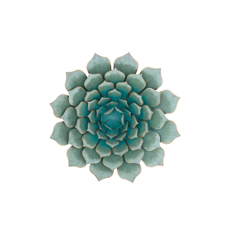 Let nature take over your wooden-themed houses and furniture with this giant version of a realistic succulent plant wall sculpture. This eye-catching large wall decoration features a dimensional plant head exterior in gradient metallic turquoise.Details:Turquoise23" x 23"IronEasy to hang featureFor indoor use only