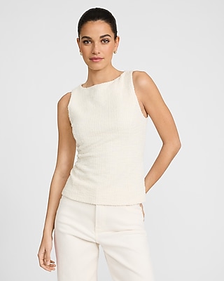 Chic and timeless, this tank is crafted from a textured tweed fabric. It is complete with a flattering boat neckline and pairs well with all of your favorite bottoms for versatile styling.