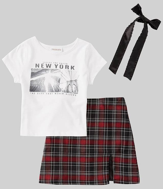 Tween Diva Big Girls 7-16 Short Sleeve Graphic T-Shirt & Plaid Skirt Set