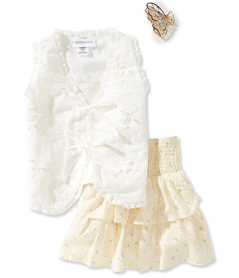 From Tween Diva, this 3-piece set features: Top: Sleeveless vest V-neckline Tie-front closure Matching sleeveless camisole top with pullover styling Skirt: Coordinating skirt Wide elastic waistband Pull-on styling Ruffled tiers Care: Vest of cotton; top of cotton/spandex; skirt of cotton (exclusive of decoration) Hand wash/line dry Imported.