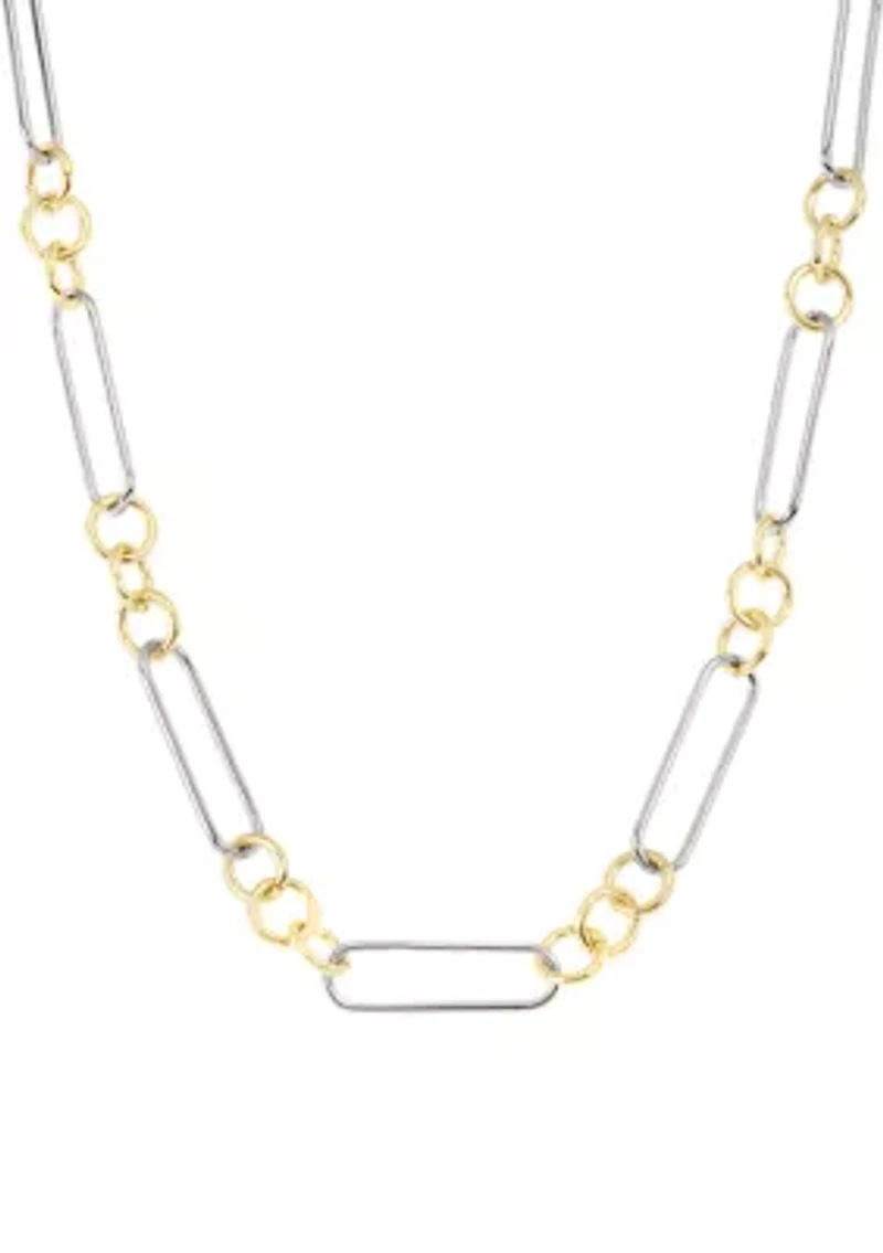 Belk Silverworks' sleek two‑tone plated paperclip necklace featuring three interlocking gold plated rings for a modern, everyday style. Its 16" plus 2" extender allows for the perfect fit. The mixed‑metal design pairs effortlessly with any outfit. Lobster closure Polished finish Imported Belk Exclusive Product Specifications 16" + 2" extender Material & Care Two-tone metal Clean with a soft cloth