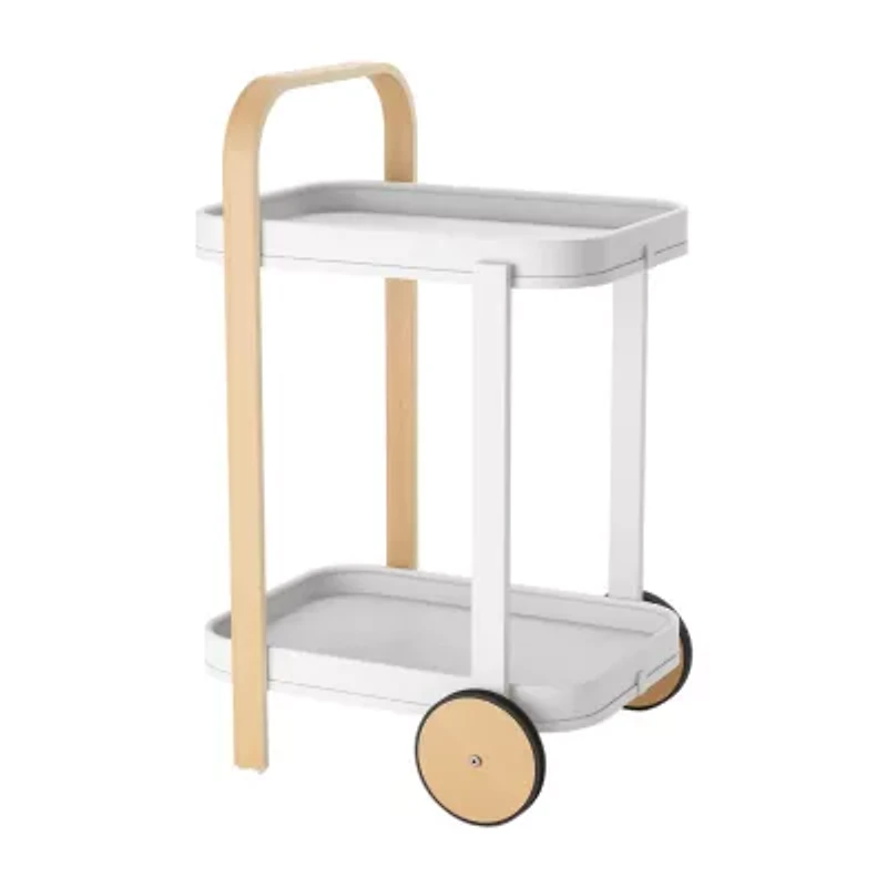 A modern, two-toned wooden bar cart, Bellwood bar and serving cart makes the perfect addition to any corner of your home. Create your own at-home bar setup or use Bellwood to make an indoor garden cart or side table. Bellwood's rubber-rimmed wheels, make it easy to move around or remove a tray to help you serve on the go or clean. With two tiers, there is plenty of space to add your bar tools and accessories, stemware, decor and more. Easy assembly with instructions and hardware.