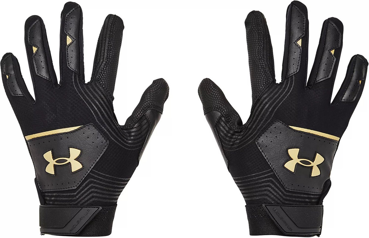 The Under Armour Boys’ Clean Up 21 Baseball Batting Gloves feature HeatGear technology and synthetic overlays.